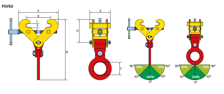 | Référence | Type | Capacité (kg/pc) | Ouverture (R) (mm) | S | T | V-max | U-max | H | X | Poids (kg/pc) |