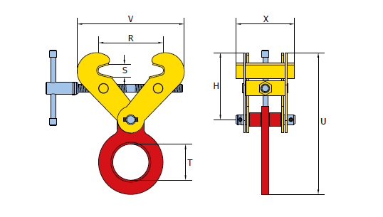 | Référence | Type | Capacité (kg/pc) | Ouverture (R) (mm) | S | T | V-max | U-max | H | X | Poids (kg/pc) |