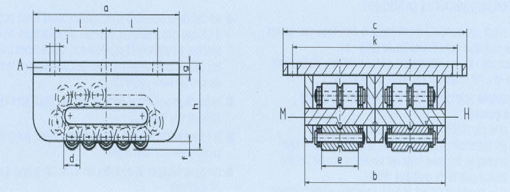 | Référence | Modèle ZAM-H | a | b | c | Ø d | e | f | g | h | Ø i | k | l | Galets en contact | Nombre de galets | Capacité unitaire en tonne | Poids (kg/pc) |